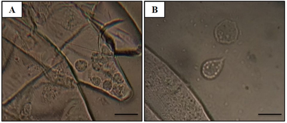 Hình 1: Các mẫu thu được từ các mảnh vỡ ướt của mang. (A) Các biến thể về hình thái của amip và (B) các amip sống tự do riêng lẻ. Thanh tỷ lệ = 20 Pha.