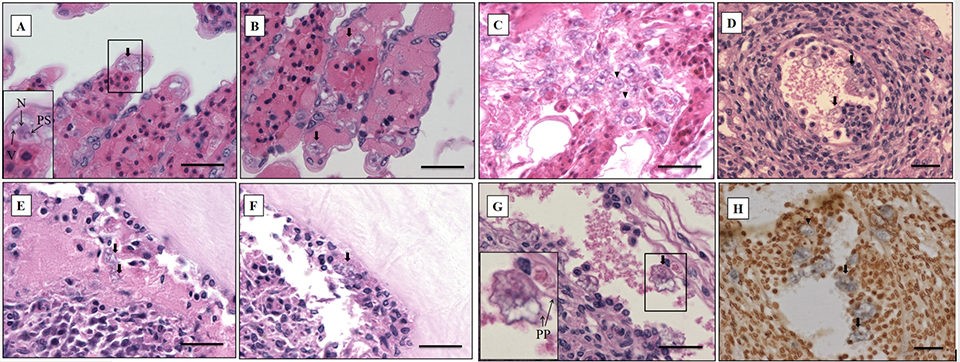 Hình 2: Nhiễm trùng amip (Paramoeba sp.) được tìm thấy trong một số mô bằng cách kiểm tra mô bệnh học và lai tạo tại chỗ. Thuốc nhuộm Mayer–Bennett hematoxylin–eosin–phloxine; (A), (B) và (C) mang, (D) tuyến râu, (E) mô dưới da, (F) biểu mô biểu bì và (G) bao ngoài bó sợi thần kinh. Bằng cách lai tại chỗ với đầu dò gen được đánh dấu digoxigenin, kết tủa màu xanh đậm cho thấy sự hiện diện của ký sinh trùng (H) trong tuyến râu. Amip đơn bào có hình dạng phẳng và không đều, thể tư dưỡng (đường kính khoảng 25 đến 30 mm; mũi tên đen), dạng nang (đường kính nhỏ hơn 10 mm; đầu mũi tên đen) và phóng đại thể tư dưỡng cho thấy nội chất dạng hạt với (V) không bào , (N) nhân, (PS) ký sinh trùng và ngoại chất với giả hành (PP). Thanh tỷ lệ = 30 mm.