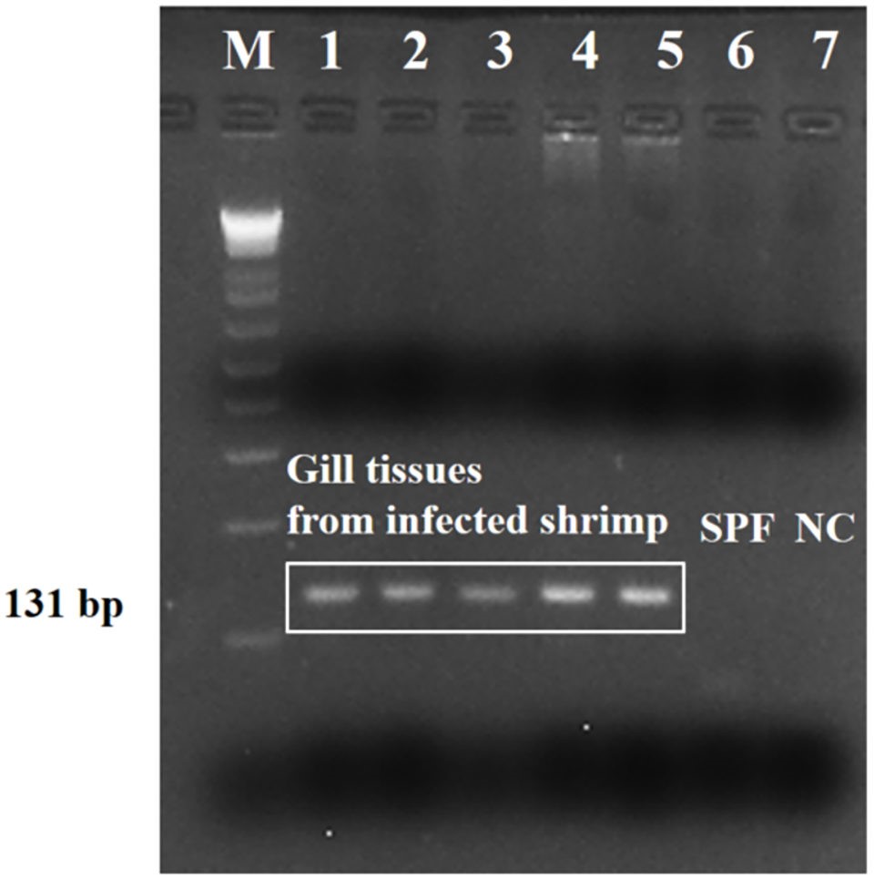 Hình 3: Xét nghiệm PCR nhắm vào các trình tự rRNA tiểu đơn vị nhỏ. Khuếch đại mạnh (131 bp) với DNA của các mô mang từ tôm bị nhiễm Paramoeba sp. (Lô 1 đến 5), tôm không có mầm bệnh cụ thể (Lô 6), đối chứng không phải mẫu (Lô 7) và 1-kb Thang DNA Plus (làn M).