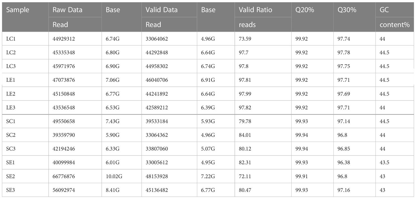 Bằng cách sử dụng máy giải trình tự Illumina Novaseq™ 6000, các mẫu ấu trùng và tôm trưởng thành từ cả nhóm đối chứng và nhóm nhiễm vi khuẩn Vibrio parahaemolyticus đều được xử lý trình tự phiên mã thông lượng cao. Trong mỗi dữ liệu, có khoảng 39.359.790 đến 66.776.776 bài đọc thô được tạo ra. Sau khi loại bỏ các lượt đọc có chứa bộ điều hợp hoặc poly-N và các lượt đọc chất lượng thấp khỏi dữ liệu thô, 33.005.612 đến 48.153.928 lượt đọc hợp lệ đã được lọc ra (Bảng 1). Chất lượng dữ liệu được đảm bảo với Q20 (xác suất lỗi trình tự cơ sở < 1%) > 99% và Q30 (xác suất lỗi trình tự cơ sở < 0,1%) > 96% trong mỗi dữ liệu (Bảng 1).