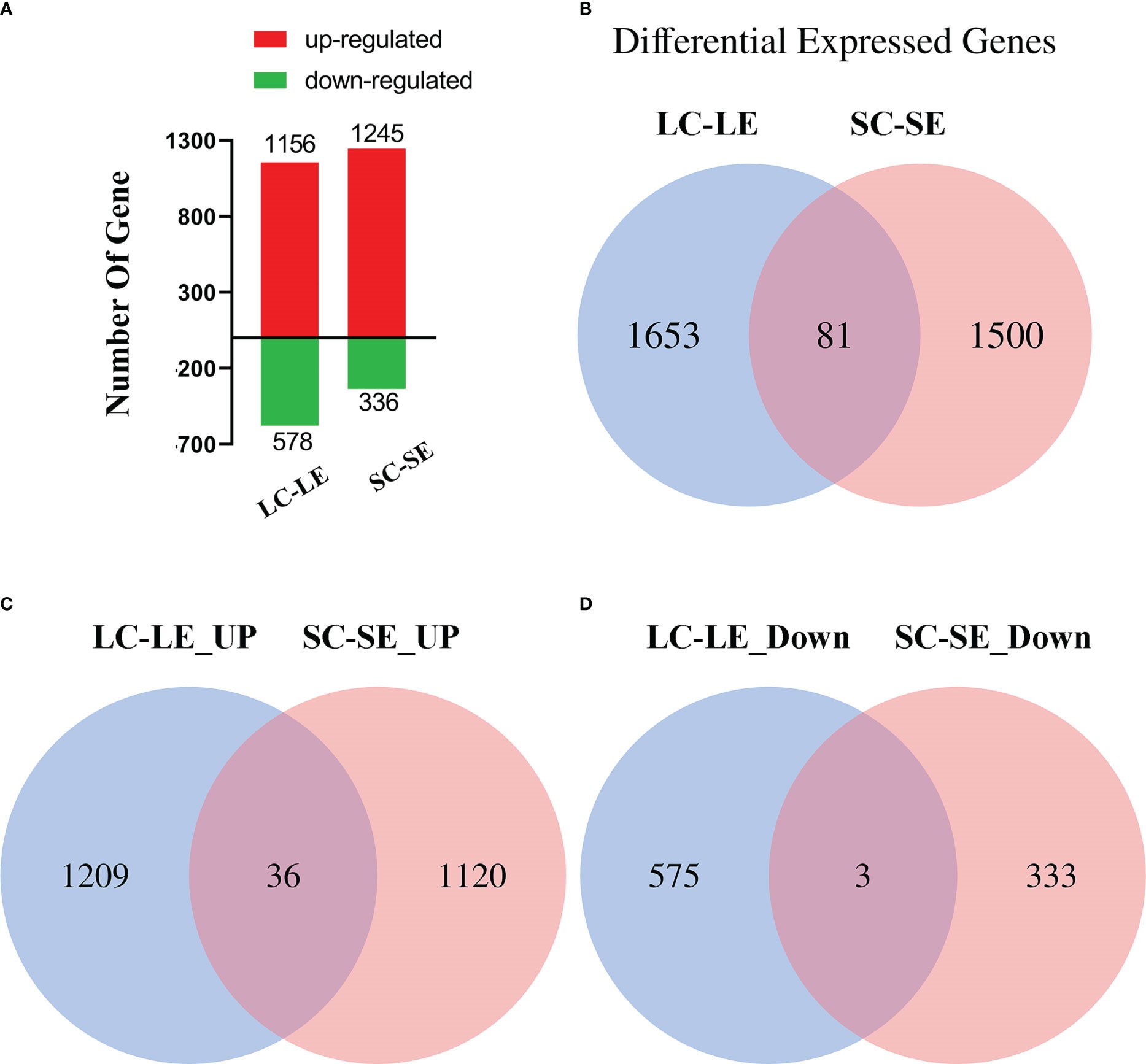 Hình 2. Kết quả thống kê của các gen biểu hiện khác nhau (DEG). (A) Số lượng gen làm việc biểu hiện khác nhau, LC-LE và SC-SE. Thanh màu đỏ cho các gen điều hòa tăng, thanh màu xanh lá cây cho các gen điều hòa giảm. (B) Biểu đồ Venn hiển thị biểu thức 2 lần của bảng phiên mã trong bảng phiên mã LC-LE và SC-SE. (C) Biểu đồ Venn hiển thị biểu thức được điều chỉnh tăng của bảng điểm trong bảng phiên mã LC-LE và SC-SE. (D) Biểu đồ Venn hiển thị biểu thức được điều chỉnh giảm của bảng phiên mã trong bảng phiên mã LC-LE và SC-SE. Kết quả phân tích thống kê đều có Padj < 0,05.