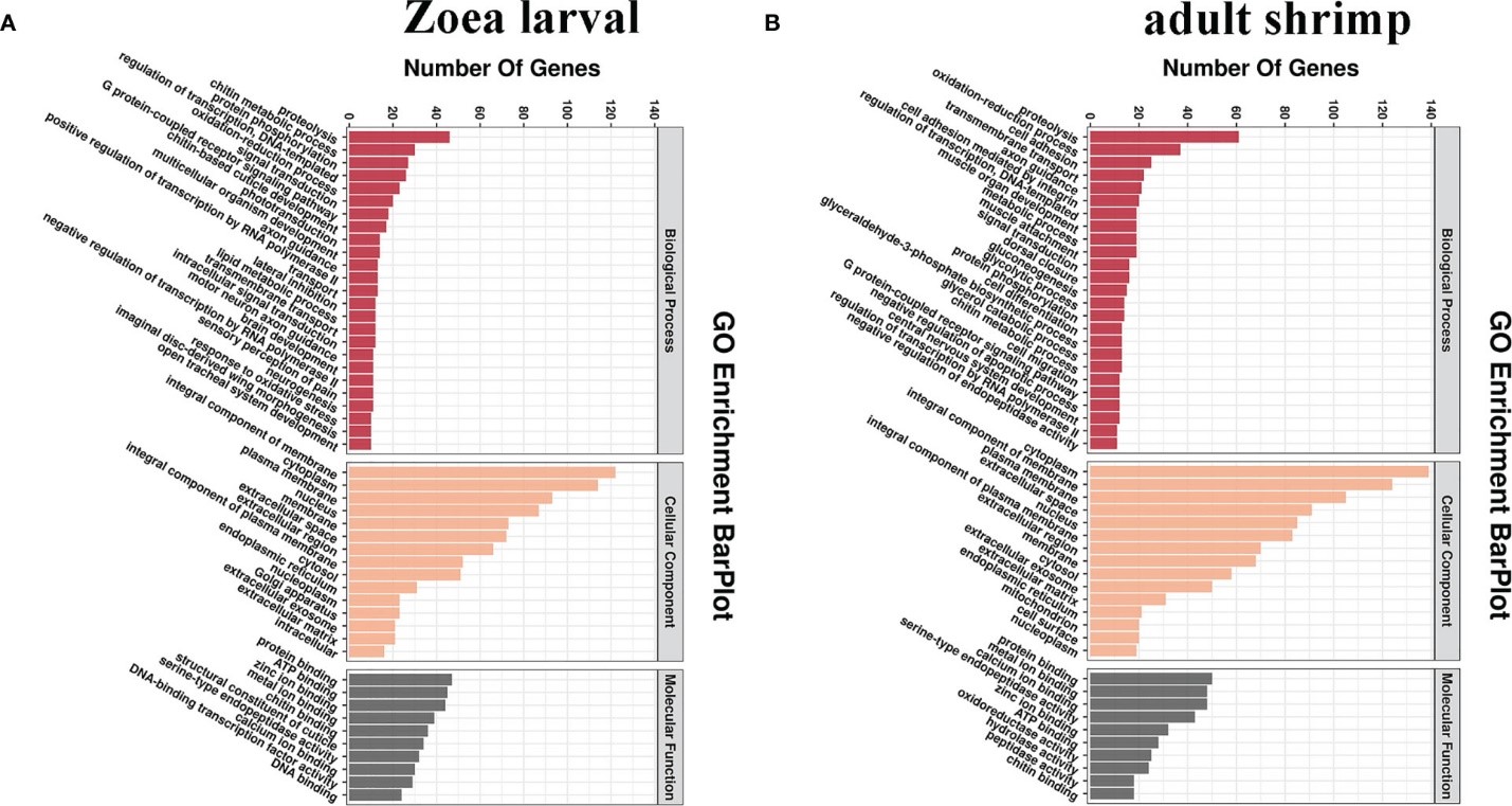 Hình 3. Phân công bản thể gen cho các gen biểu hiện khác nhau (DEG) ở ấu trùng Zoea và tôm trưởng thành sau khi nhiễm V. parahaemolyticus. Kết quả phân loại GO được tóm tắt thành ba loại GO chính (thành phần tế bào, chức năng phân tử và quá trình sinh học). (A) Phân tích GO để tìm các gen trên ấu trùng Zoea bị nhiễm V. parahaemolyticus. (B) Phân tích GO cho các gen trên tôm trưởng thành bị nhiễm V. parahaemolyticus.