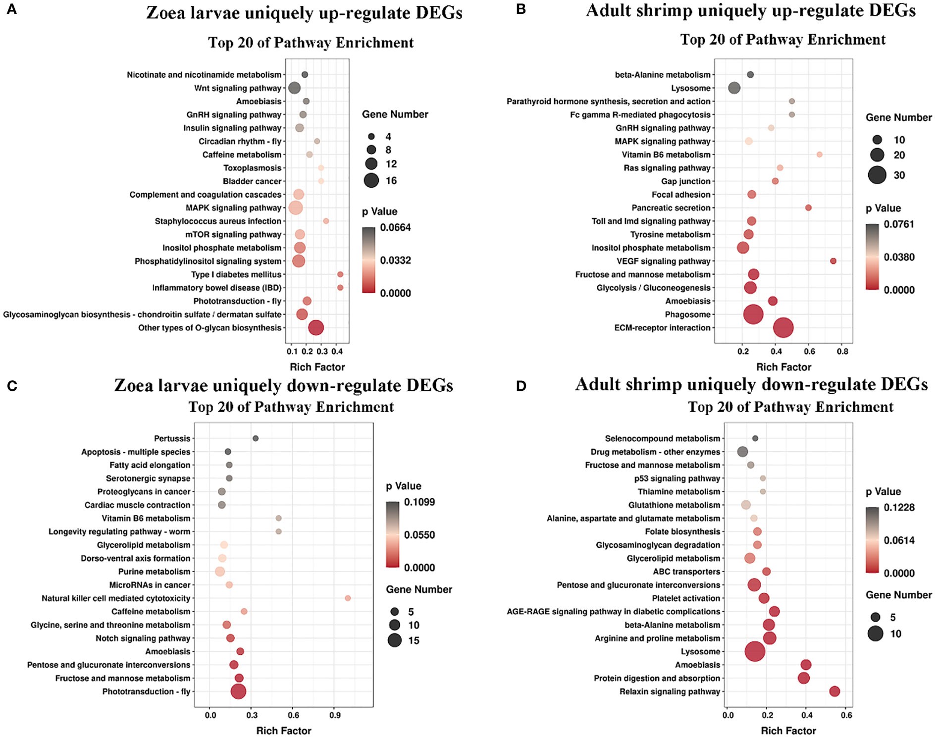 Hình 4 Sơ đồ phân tán làm giàu con đường KEGG. Trục biểu thị tên của đường dẫn, trục hoành biểu thị hệ số phong phú tương ứng của đường dẫn, kích thước của giá trị p được biểu thị bằng màu của điểm. Số lượng gen khác biệt được biểu thị bằng kích thước của điểm. (A) Làm phong phú thêm các thuật ngữ KEGG bằng các gen điều chỉnh tăng duy nhất sau khi ấu trùng Zoea bị nhiễm Vibrio parahaemolyticus. (B) Làm phong phú thuật ngữ KEGG của các gen điều chỉnh tăng duy nhất sau khi nhiễm Vibrio parahaemolyticus ở con trưởng thành. (C) Làm phong phú thêm các thuật ngữ KEGG bằng các gen điều hòa giảm duy nhất sau khi ấu trùng Zoea bị nhiễm Vibrio parahaemolyticus. (D) Làm phong phú thêm các thuật ngữ KEGG dành riêng cho các gen bị điều hòa giảm sau khi nhiễm Vibrio parahaemolyticus ở con trưởng thành.