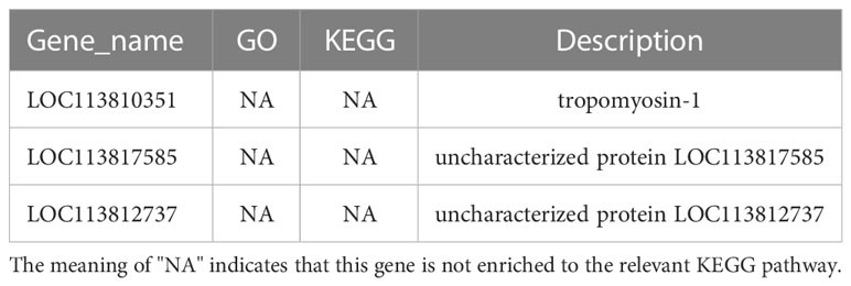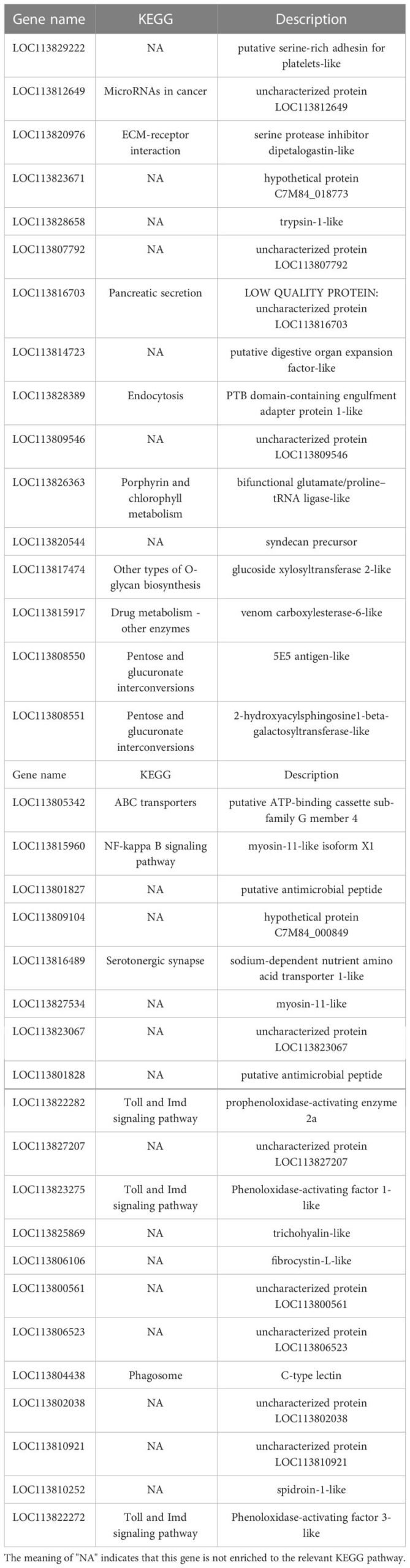 Cơ sở dữ liệu con đường KEGG là cơ sở dữ liệu để phân tích sản phẩm gen trong quá trình trao đổi chất và các chức năng gen liên quan trong quá trình tế bào. Phân tích dựa trên con đường giúp chúng ta hiểu rõ hơn về chức năng sinh học của gen (Yi và cộng sự, 2020). 551 DEG được tìm thấy trong các nhóm LC-LE được liên kết với 236 con đường KEGG đã biết trong cuộc điều tra này. 402 DEG được liên kết với 178 con đường KEGG đã biết cho các nhóm SC-SE. Trên cơ sở một nghiên cứu trước đó về sơ đồ Venn của DEG, các phân tích làm giàu KEGG cho cả DEG được điều chỉnh tăng và giảm trong mỗi nhóm đã được tiến hành (Hình 4A–D). Các DEG được điều chỉnh đặc biệt trong nhóm LC-LE chủ yếu được làm phong phú theo các con đường miễn dịch như đường dẫn tín hiệu MAPK, các tầng bổ sung và đông máu cũng như đường dẫn tín hiệu mTOR (Hình 4A). Việc điều chỉnh tăng các DEG dành riêng cho nhóm SC-SE, chủ yếu được làm phong phú thêm trong các con đường miễn dịch bao gồm tương tác với thụ thể ECM, đường dẫn tín hiệu Lysosome, Toll và Imd, đường dẫn tín hiệu VEGF và đường dẫn tín hiệu MAPK (Hình 4B). Các DEG được điều hòa giảm đặc biệt trong nhóm LC-LE tập trung vào quá trình dẫn truyền quang – ruồi, chuyển hóa Purine và con đường chuyển hóa Fructose và mannose (Hình 4C). Các DEG được điều chỉnh giảm cụ thể trong nhóm SC-SE chủ yếu tập trung vào quá trình chuyển hóa Lysosome, Arginine và proline cũng như các con đường chuyển đổi xen kẽ Pentose và glucuronate (Hình 4D). Tổng cộng có 36 DEG được điều hòa trong nhóm LC-LE và SC-SE (Bảng 2), trong đó các gen liên quan đến miễn dịch là: chất ức chế serine protease giống dipetalogastin, lectin loại C, yếu tố kích hoạt Phenoloxidase 3 giống, Yếu tố kích hoạt phenoloxidase giống 1, enzyme kích hoạt prophenoloxidase 2a và peptide kháng khuẩn giả định. Các con đường miễn dịch được làm phong phú ở cả hai gen được điều hòa lên là: tương tác với thụ thể ECM, Endocytosis, đường dẫn tín hiệu NF-kappa B, đường dẫn tín hiệu Toll và Imd và phagosome. Ba gen được điều hòa giảm phổ biến trong nhóm LC-LE và SC-SE (Bảng 3), tropomyosin-1, protein không bị biến đổi LOC113817585 và protein không bị biến đổi LOC113812737.