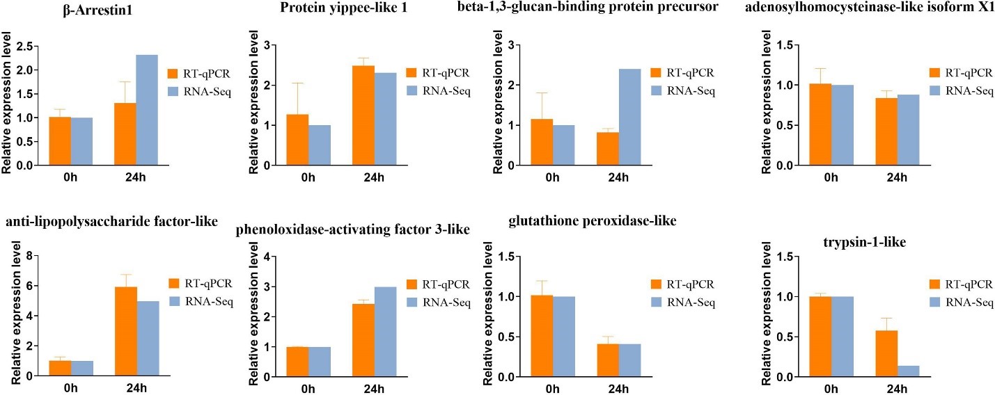 Để xác thực các kiểu biểu hiện của DEG sau khi bị nhiễm Vibrio parahaemolyticus ở ấu trùng Zoea và tôm trưởng thành, chúng tôi đã chọn 8 DEG để phân tích qRT-PCR (Hình 5) bao gồm 5 gen điều hòa tăng và 3 gen điều hòa giảm. Cấu hình biểu thức của tất cả các IRD được chọn từ qPCR được so sánh với cấu hình biểu thức từ RNA-seq. Những thay đổi mạnh mẽ về mức độ biểu hiện gen của 8 DEG này sau khi kích thích trong 24 giờ: β-Arrestin1, Protein yippee-like 1, tiền chất protein gắn với beta-1,3-glucan, giống yếu tố kháng lipopolysaccharide và kích hoạt phenoloxidase giống yếu tố 3 được điều chỉnh tăng đáng kể, trong khi mức độ biểu hiện của isoform X1 giống adenosylhomocysteinase, giống glutathione peroxidase và giống trypsin-1 được điều chỉnh giảm đáng kể.
