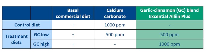 Bảng 2. Chế độ ăn đối chứng và chế độ ăn thử nghiệm trong thí nghiệm về hiệu quả của hỗn hợp tỏi-quế (GC)