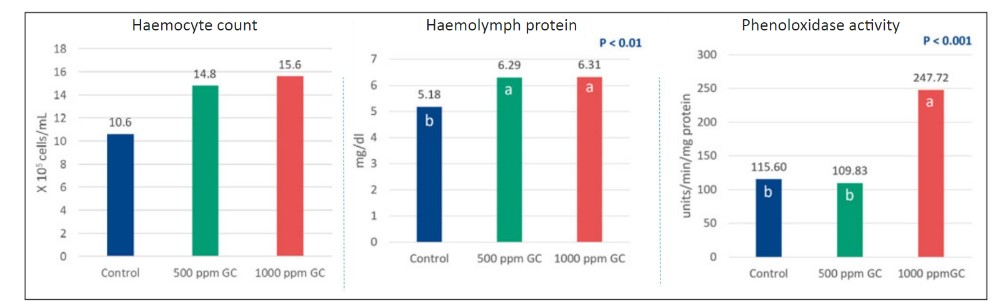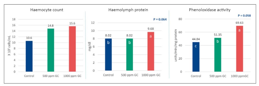Vì giá trị dinh dưỡng của sản phẩm chứa bột tỏi/quế thấp (nó không phải là nguồn protein, chất béo hay năng lượng) và mức độ bổ sung không đáng kể, nên hiệu quả sử dụng thức ăn tăng lên có thể liên quan đến tình trạng sức khỏe của tôm tăng lên. Tác dụng có lợi của PFA đã được xác nhận trong thử nghiệm này, cụ thể là tình trạng miễn dịch tổng thể đã được cải thiện ở nghiệm thức không cảm nhiễm với vi khuẩn, đặc biệt là trong chế độ ăn được bổ sung GC ở mức cao (Hình 4).