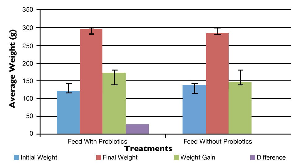 Hình 1: Trọng lượng và mức tăng trọng trung bình của cá rô phi được cho ăn chế độ ăn có bổ sung probiotic và chế độ ăn đối chứng.