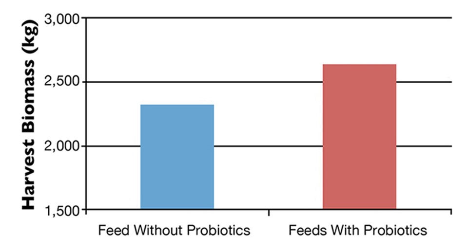 Năng suất của cá ở cả hai nhóm được đánh giá sau 54 và 59 ngày nuôi. Việc bổ sung probiotic chứa Bacillus vào thức ăn cho cá rô phi đã được chứng minh là cải thiện tăng trọng và tỷ lệ sống, vì vậy sản lượng thu hoạch cao hơn (Hình 1 và 2). Mức tăng trưởng hàng ngày được tính toán là 3,23g đối với cá nhận được thức ăn có bổ sung Bacillus, so với 2,38g ở nhóm đối chứng. Cá rô phi trong nhóm đối chứng có tỷ lệ sống khoảng 84%, trong khi tỷ lệ sống ở nhóm được bổ sung probiotic là khoảng 92%.