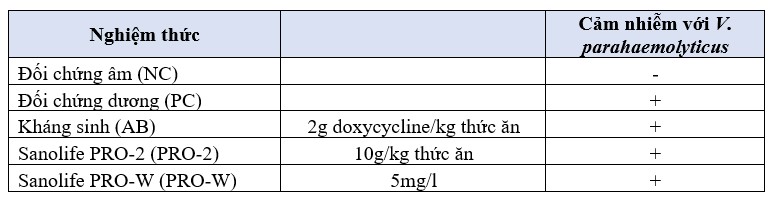 Sanolife PRO-2 được trộ vào thức ăn mỗi khi cho tôm ăn và Sanolife PRO-W được thêm vào nước mỗi ngày một lần. Liều Sanolife PRO-2 là 2×108 CFU Bacillus/gram thức ăn và liều Sanolife PRO-W là 2,5×105 CFU Bacillus/ml nước. Trừ nghiệm thức đối chứng âm, tất cả các nghiệm thức còn lại đều được cảm nhiễm với với 2×105 CFU/mL LTS14 và việc theo dõi lâm sàng được thực hiện trong 15 ngày sau cảm nhiễm.