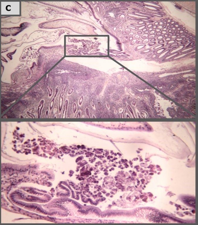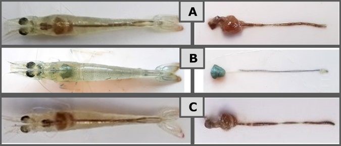 Hình 2: Các dấu hiệu tổng thể sau 48 giờ cảm nhiễm với 2×105 CFU/ml V. parahaemolyticus LTS14. (A) tôm thuộc nhóm đối chứng âm (NC), (B) tôm thuộc nhóm đối chứng dương (PC), (C) tôm được xử lý bằng Sanolife PRO-2. Các dấu hiệu tổng thể của AHPND: thiếu thức ăn trong ruột, gan tụy nhợt nhạt và teo gan tụy có thể được ghi nhận rõ ràng ở tôm thuộc nhóm PC. Sự xuất hiện các dấu hiệu bệnh có dấu hiệu chậm lại và giảm dần ở tôm được xử lý bằng Sanolife PRO-2.