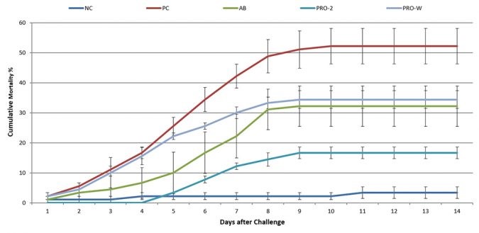 Tỷ lệ chết bắt đầu ở nhóm PC là 1 ngày sau khi cảm nhiễm và tỷ lệ chết tích lũy đạt 52±10% sau 10 ngày (Hình 3). Trong nhóm AB và Sanolife PRO-W, tỷ lệ chết cũng bắt đầu từ 1 ngày và tỷ lệ chết lũy lần lượt đạt 32±12% và 34±5%. Tỷ lệ chết chậm hơn, tức 4 ngày sau khi cảm nhiễm được ghi nhận ở nhóm Sanolife PRO-2, với tỷ lệ chết tích lũy dừng ở mức 17±3% sau 9 ngày. Về mặt thống kê, kết quả của Sanolife PRO-2 thấp hơn đáng kể so với PC, nhưng vẫn cao hơn so với NC (3±3%).