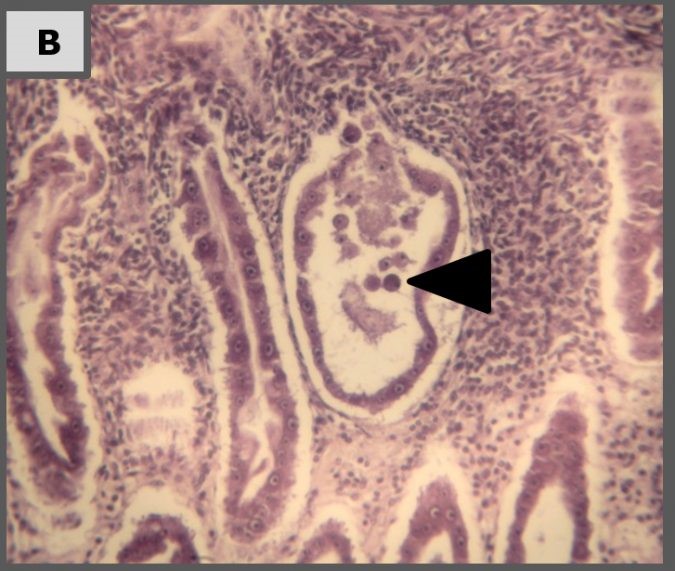 Hình 4B: Đối chứng dương (4 ngày sau cảm nhiễm): Các tế bào biểu mô gan tụy trở nên tròn và bong tróc do độc tố V. parahaemolyticus (đầu mũi tên) trong ống hoại tử, được bao quanh bởi lớp vỏ bọc hồng cầu dày.