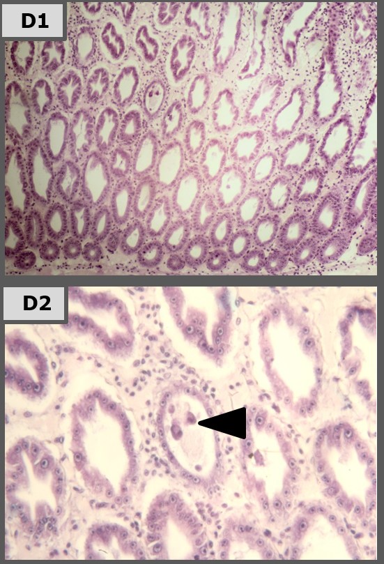 Hình 4D: Sanolife PRO-2 (10 ngày sau cảm nhiễm): Quan sát thấy các tế bào biểu mô gan tụy trở nên tròn và bong tróc không đều (đầu mũi tên D2). Chiều cao biểu mô giảm so với NC, nhưng việc giảm biệt hóa tế bào không đáng kể (chủ yếu là ít tế bào B hơn). Sự thâm nhiễm hồng cầu ít hơn, khoảng kẽ xuất hiện nhiều sợi hơn.