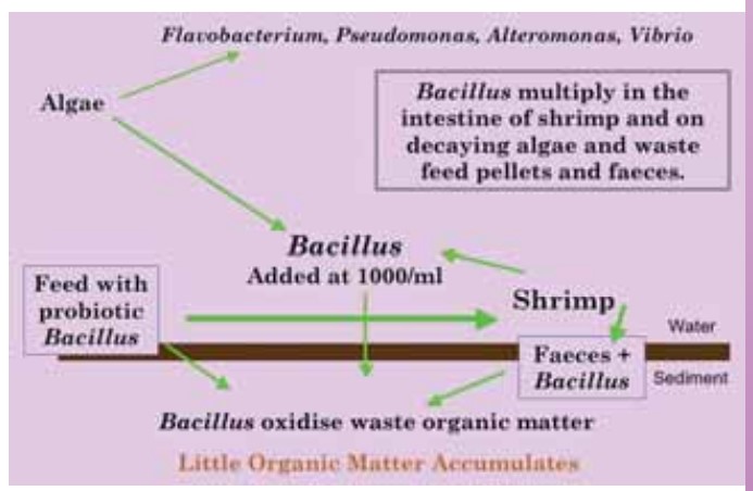 Điều quan trọng là phải đảm bảo rằng các mảnh vụn hữu cơ và chất nhớt không tích tụ ở đáy ao. Tất cả phân, thức ăn thừa và xác tảo tàn phải được phân hủy nhanh chóng. Chỉ sục khí thôi là chưa đủ. Quần thể vi khuẩn đang hoạt động phải được thay đổi thành những loài thích nghi với sự phân hủy nhanh chóng của các phân tử hữu cơ phức tạp. Nhóm Bacillus sản xuất nhiều loại exo-enzyme rất hiệu quả trong việc phân hủy các phân tử lớn như protein và chất béo.