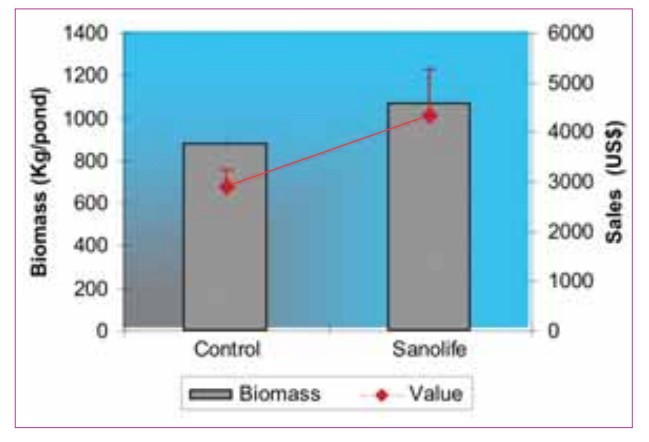 Vào năm 2004, trang trại Teknomin ở Andra Pradesh, Ấn Độ cho thấy 25% tôm sú Penaeus monodon đạt trọng lượng 34 g/con trong 3 ao được bổ sung probiotic vào thức ăn (Hình 2). Trong khi kích thước trung bình lớn nhất của tôm trong các ao đối chứng chỉ là 25 g/con trong cùng khoảng thời gian nuôi 115 ngày. Do đó, lợi nhuận ròng sẽ lớn hơn nhiều khi sử dụng probiotic (Hình 3). Điều này đạt được bằng cách sử dụng các probiotic tương ứng trong nước và bằng cách kết hợp các probiotic Sanolife® trong tất cả thức ăn, để các loài Bacillus có thể xâm nhập vào đường ruột của tôm và cạnh tranh thành công với các loài Vibrio gây bệnh.