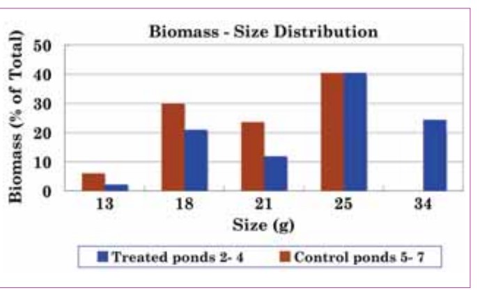 Hình 2: Phân bổ sinh khối và kích cỡ tôm tại trang trại Teknomin. Giá trị trung bình được tính dựa trên 3 ao được xử lý bằng Sanolife® PRO-W trong nước và Sanolife® PRO-1 và PRO-2 trong thức ăn của tôm sú Penaeus tại trang trại Teknomin ở Andra Pradesh, Ấn Độ và 3 ao đối chứng. Mật độ thả 10 con/m2.