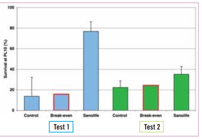Hình 4. Trong 2 thử nghiệm riêng biệt được thực hiện trong khoảng thời gian 1 năm ở Thái Lan, ấu trùng naup Penaeus monodon được nuôi đến PL10 và được cho ăn kết hợp Chaetoceros, ấu trùng Artemia và Tôm Lansy (thay thế 40% thức ăn sống) trong chế độ ăn cho ấu trùng của INVE. Trong các thử nghiệm này, việc sử dụng probiotic SANOLIFE MIC hàng ngày ở nồng độ cuối cùng là 1-5x104 cfu/ml nước bể cho kết quả tương tự như kết quả được quan sát thấy khi sử dụng kháng sinh dự phòng và có kết quả tích cực về tỷ lệ sống. Trong cả hai thử nghiệm, lợi nhuận ròng đã đạt được ở nhóm sử dụng Sanolife® MIC, trong khi tỷ lệ sống ở nhóm đối chứng thấp hơn mức cần thiết để đạt được mức hòa vốn.