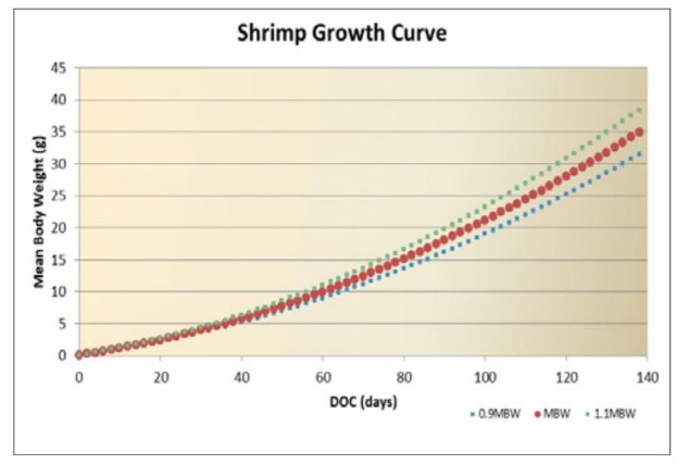 Đường cong tăng trưởng tiêu chuẩn cho từng địa điểm sản xuất tôm cần được phát triển, điều chỉnh khi cần thiết và duy trì để quản lý ao và thức ăn một cách hợp lý. Tốc độ tăng trưởng hàng ngày của từng ao nên được theo dõi và so sánh với đường cong tăng trưởng tiêu chuẩn. Nếu tốc độ tăng trưởng nằm trong khoảng ±10% so với mức tiêu chuẩn, thì điều kiện ao nuôi và quản lý thức ăn ở mức chấp nhận được. Nếu tốc độ tăng trưởng thấp hơn đường cong tiêu chuẩn, người nuôi cần kiểm tra xem chất lượng nước, đáy ao và/hoặc sức khỏe vật nuôi có ở mức chấp nhận được hay không. Nếu mọi thứ đều tốt thì tiến hành tăng tỷ lệ cho ăn. Nếu đường cong tăng trưởng cao hơn đường cong tiêu chuẩn thì điều kiện ao tốt nhưng tỷ lệ sống có thể thấp hơn mong đợi. Xem xét giảm tỷ lệ cho ăn để duy trì FCR ở mức chấp nhận được.