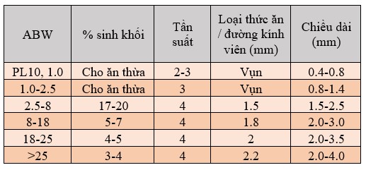Bảng 1. Một số loại và kích cỡ thức ăn viên được khuyến nghị chung trong nuôi tôm liên quan đến trọng lượng cơ thể trung bình (ABW)