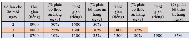 Bảng 2. Ví dụ về phân bổ thức ăn tùy thuộc vào số lần cho ăn/ngày.