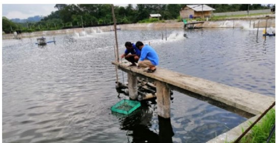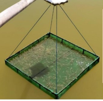 Nâng khay ăn từ từ cho phép quan sát tình trạng sức khỏe tôm và độ đồng đều về kích cỡ, Indonesia. Khay ăn thường có hình vuông hoặc hình tròn.