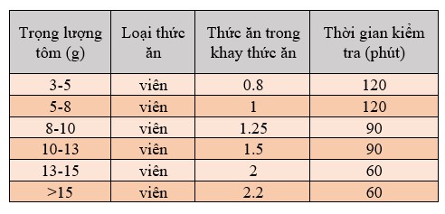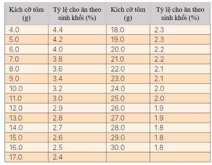 Nên có một lượng thức ăn tối thiểu được phân bổ cho mỗi lần cho ăn theo diện tích ao và không nhất thiết phải theo tỷ lệ cho ăn dựa trên sinh khối của tôm dưới 4g (Bảng 2).