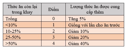 Bảng 4. Phân bổ điểm và các chương trình điều chỉnh cho ăn dựa trên thức ăn còn lại trong khay.