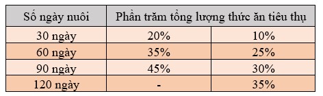 Bảng 5. Lượng thức ăn tiêu thụ trong tháng theo chu kỳ 90 ngày, chu kỳ 120 ngày