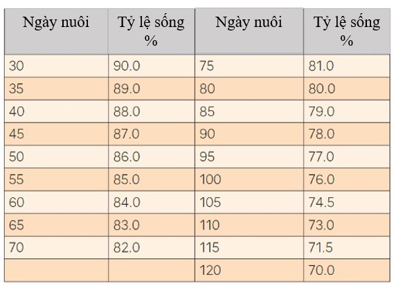 Bảng 7. Ngày nuôi (DOC) với tỷ lệ sống ước tính (%) dựa trên +/- 70% tỷ lệ sống khi thu hoạch.