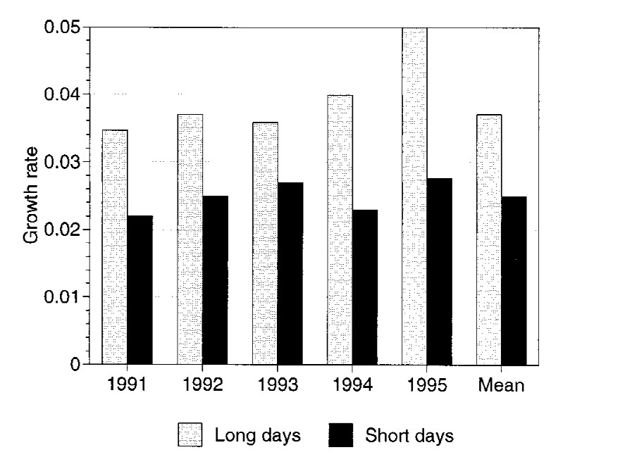 Hình 2. Tốc độ tăng trưởng tức thời trung bình được ghi nhận trong điều kiện nuôi thương phẩm trong suốt thời gian ánh sáng như mùa hè (LD 16:8) và mùa đông (LD 8:16) ở nhiệt độ không đổi ở vùng Đông Bắc nước Anh. (Dữ liệu được cung cấp bởi Seabait Ltd). Những dữ liệu này chỉ là dữ liệu tham khảo và không thể áp dụng sai số chuẩn cho các giá trị trung bình đã cho. Tuy nhiên, nghiên cứu với những điều kiện được kiểm soát chặt chẽ hơn đã xác nhận những xu hướng này.