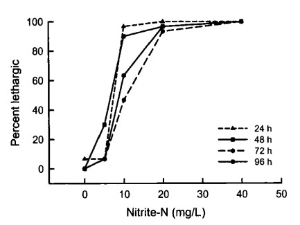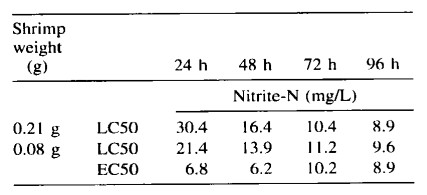 Giá trị EC50 trong 96 giờ không được sử dụng phổ biến trong nuôi trồng thủy sản. Tuy nhiên, thông tin bổ sung này có thể được thu thập trong các thử nghiệm LC50 trong 96 giờ, có thể giúp đánh giá nồng độ an toàn chính xác hơn. Điều thú vị là ở nồng độ 5 và 10 mg/L NO2-N, tôm bị ảnh hưởng nhiều hơn được quan sát thấy sau 24 và 48 giờ sau khi bắt đầu thí nghiệm so với 72 và 96 giờ. Trong các nghiệm thức đó, một số tôm dường như đã phục hồi sau áp lực ban đầu do nồng độ nitrit tăng cao. Các giá trị LC50 và EC50 từ 24 đến 72 giờ cũng được trình bày (Bảng l), mặc dù những giá trị này cũng không được sử dụng phổ biến trong nuôi trồng thủy sản.