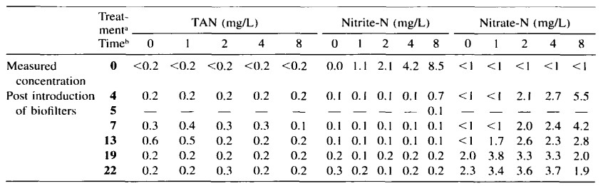 2 ngày sau khi sử dụng bộ lọc, nồng độ nitrit-nitơ trong tất cả các nghiệm thức đều nhỏ hơn 0,2 mg/L, ngoại trừ trong các bể ban đầu chứa 8 mg/L NO2-N. Nồng độ trung bình trong các bể cá này là 0,7 mg/L, nhưng giảm xuống dưới 0,2 mg/L một ngày sau đó (Bảng 2). Trong suốt phần còn lại của thí nghiệm, tất cả các bể cá đều được xử lý như nhau và sự thay đổi về chất lượng nước không khác biệt đáng kể giữa các nghiệm thức (P < 0,05). Nồng độ nitơ vô cơ thấp và có thể chấp nhận được cho tôm phát triển bình thường.