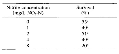 Bảng 3. Tỷ lệ sống ở L. vannamei 19 ngày sau khi phơi nhiễm với các nồng độ nitrit khác nhau. Các chữ cái chỉ số trên khác nhau thể hiện sự khác biệt đáng kể trong mỗi cột.