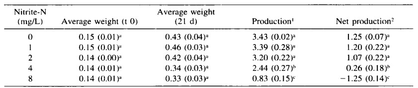 Sản lượng ròng được tính bằng tổng trọng lượng vào cuối nghiên cứu trừ đi trọng lượng ban đầu của tôm. Sản lượng ròng trung bình của tôm phơi nhiễm với 8 mg/L NO2-N là âm và thấp hơn đáng kể so với các nghiệm thức khác (Bảng 4). Tôm được phơi nhiễm với 4 mg/L NO2-N có tốc độ tăng trưởng chậm hơn so với tôm được nuôi trong môi trường 0, 1 và 2 mg/L NO2-N, nhưng tỷ lệ sống tương tự ở các nồng độ này (Bảng 3). Sản lượng ròng ở mức 4 mg/L NO2-N trung bình là 0,26 g trong khi ở các mức nitrit khác (0, 1, 2 mg/L NO2-N) là trên 1 g (Bảng 4). Không tìm thấy tác động tiêu cực nào ở tôm phơi nhiễm với 0, 1 hoặc 2 mg/L NO2-N trong 2 ngày.