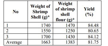 Nghiên cứu này cho thấy năng suất thu được từ việc chế biến bột vỏ tôm là 81,75%. Năng suất này cao hơn so với các nghiên cứu trước đây. Quá trình giảm kích thước hạt (tinh chế) được thực hiện để biến vỏ tôm thành bột. Giá trị năng suất thu được trong nghiên cứu này cao hơn giá trị năng suất thu được của (Pratiwi và cộng sự, 2017) chỉ tạo ra năng suất trung bình khoảng 15,95%.