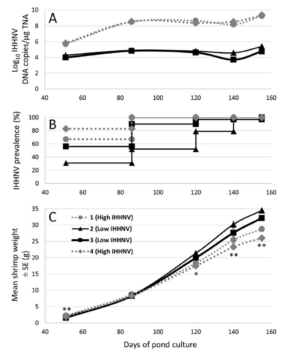 Hình 1. (A) Log10 bản sao DNA IHHNV trung bình/μg TNA được xác định bằng qPCR thời gian thực sử dụng mô pleopod của 48 trong số 144 con tôm được lấy mẫu từ mỗi trong số 4 ao tại mỗi thời điểm, ngoại trừ ở 140 DOC khi cơ quan bạch huyết mô từ 30 con tôm đã được thử nghiệm. (B) Mức độ phổ biến (%) mà tại đó IHHNV được phát hiện bằng qPCR thời gian thực ở 48 con tôm được kiểm tra từ mỗi ao tại mỗi thời điểm, ngoại trừ ở mức 140 DOC khi mức độ phổ biến chỉ được đánh giá cho 30 con tôm. (C) Trọng lượng tôm trung bình ± SE (gam) của 144 con tôm/ao được lấy mẫu tăng dần trong suốt quá trình nuôi thương phẩm ngoại trừ ở 140 DOC khi chỉ có 30 con tôm/ao được cân. Các mức ý nghĩa thống kê (* P < 0,05; ** P < 0,001) được xác định bằng cách sử dụng trọng lượng trung bình được biến đổi logarit của tôm từ các ao 1 và 4 có mức độ IHHNV cao kết hợp với nhau và các ao có mức độ IHHNV thấp 2 và 3 được kết hợp tại mỗi thời điểm lấy mẫu điểm.