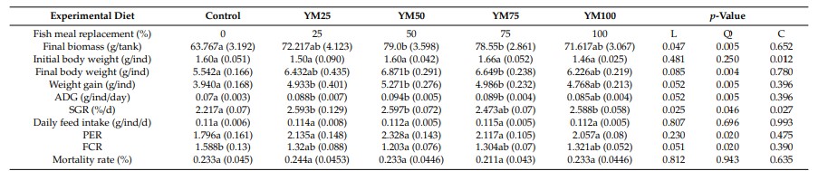 Các phân tích cho thấy phản ứng bậc hai đáng kể đối với việc thay thế FM ở cả sinh khối cuối cùng và trọng lượng cơ thể (lần lượt là p = 0,005 và p = 0,004, Bảng 3). Sinh khối cuối cùng và trọng lượng cơ thể lớn nhất đạt được nhờ khẩu phần trong đó 50% FM được thay thế bằng YM; trọng lượng cơ thể tăng 24% khi so sánh với nhóm đối chứng (thay thế FM 0%, Bảng 3) Tương tự, phản ứng bậc hai đáng kể đối với việc thay thế FM đã được quan sát thấy khi tăng cân (p = 0,005). Sự khác biệt tăng cân lớn nhất (34%) được quan sát thấy ở nhóm ăn kiêng thay thế 50% FM so với nhóm đối chứng. SGR cho thấy phản ứng bậc ba (p = 0,0272); có xu hướng tăng SGR ở nhóm nhận khẩu phần ăn thay thế 25% FM so với nhóm đối chứng. SGR của các nhóm nhận được khẩu phần ăn thay thế 50% và 100% FM tương ứng cao hơn đáng kể so với nhóm đối chứng mặc dù SGR ở các nhóm này không khác biệt đáng kể với nhau. Chúng tôi quan sát thấy không có sự khác biệt đáng kể về tỷ lệ tôm chết giữa các nhóm khẩu phần ăn.