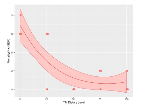 Mô hình hồi quy tuyến tính tổng quát với phân bố sai số nhị thức được sử dụng để phân tích tỷ lệ chết. Tỷ lệ chết giảm dần khi thay thế bột cá (FM) bằng men bia (YM). Độ dốc của đường giảm dần này trở nên ổn định sau khi thay thế 50% FM. Nhóm thay thế 50% FM có tỷ lệ chết thấp nhất, chỉ bằng 1/4 so với nhóm đối chứng (không thay thế FM). Ngoại trừ nhóm thay thế 25% FM, tất cả các nhóm thay thế FM khác đều có tỷ lệ chết thấp hơn đáng kể so với nhóm đối chứng.