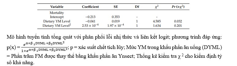 Bảng 4. Tỷ lệ chết theo hàm lượng bột côn trùng trong khẩu phần ăn (YM).