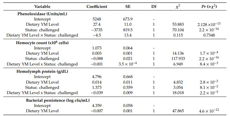 Việc giảm hoạt động PO do nhiễm trùng có thể là do việc sử dụng enzyme để chống lại nhiễm trùng. Tuy nhiên, mức PO vẫn cao hơn ở tôm được cho ăn YM. Hơn nữa, khả năng loại bỏ mầm bệnh của tôm, được thử nghiệm 3 giờ sau cảm nhiễm tiêm, tăng lên khi hàm lượng YM trong khẩu phần ăn tăng.; có ít vi khuẩn tồn tại hơn đáng kể trong hemolymp của tôm được cho ăn ở mức YM cao hơn.