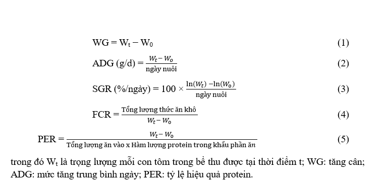 Trong thời gian thử nghiệm, lượng thức ăn được cung cấp đã được ghi lại và thức ăn thừa được cân sau khi hút, lọc và sấy khô. Những dữ liệu này được sử dụng để tính toán lượng thức ăn tiêu thụ. Tôm được lấy mẫu hai tuần một lần cho đến hết 8 tuần để đánh giá tăng trưởng. Tỷ lệ chết được theo dõi hàng ngày. Hiệu suất tăng trưởng được ước tính thông qua việc đánh giá mức tăng cân, mức tăng cân trung bình hàng ngày, tốc độ tăng trưởng cụ thể (SGR) và tỷ lệ chết. Hiệu suất sử dụng thức ăn được ước tính bằng tỷ lệ chuyển đổi thức ăn (FCR) và hiệu quả sử dụng protein (PER).