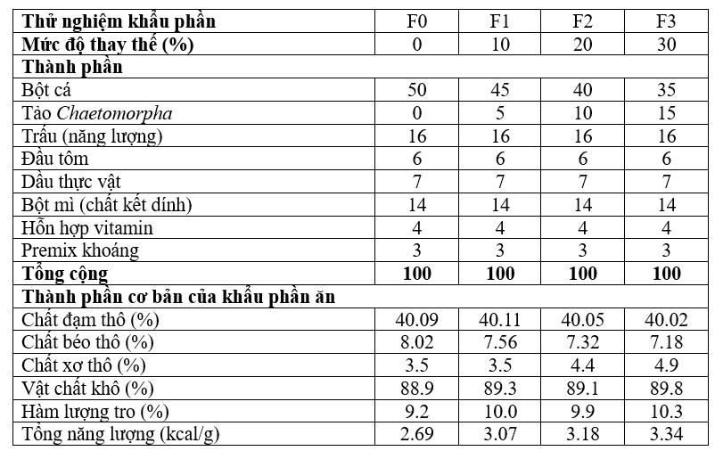 Bốn nguồn thức ăn thử nghiệm (F0 – đối chứng, F1, F2 và F3) với mức thay thế FM lần lượt là 0, 10, 15 và 20%, được lập công thức như trong Bảng 1. Các nguồn thức ăn thử nghiệm được nghiền lại bằng máy nghiền hạng nặng để tạo thành một loại bột ne, sau đó trộn với nước trong máy xay thực phẩm để tạo thành bột nhào. Bột được nấu trong 10 phút bằng cách hấp. Bột đã nấu chín được chuyển thành dạng viên vụn bằng máy tạo viên cơ học. Viên được sấy khô ở 90℃ trong 1 phút, giảm độ ẩm xuống khoảng 18%, sau đó sấy khô thêm ở 60℃ để giảm độ ẩm xuống khoảng 8%. Thức ăn viên khô được bảo quản ở nhiệt độ phòng để làm thí nghiệm cho ăn.
