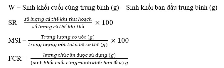 Khi kết thúc thí nghiệm, 10 con tôm được lấy ngẫu nhiên từ mỗi đơn vị thí nghiệm và trọng lượng của mỗi cá thể được ghi lại. Sau đó, tôm được đông lạnh trong 48 giờ để tạo điều kiện thuận lợi cho quá trình bong tróc, sau đó là loại bỏ vỏ ngoài. Bùn thu được được bảo quản ở nhiệt độ -36℃ trước khi phân tích thành phần sinh hóa. Mỗi giá trị sinh hóa được xác định trong 3 lần nhắc lại và biểu thị bằng % trọng lượng ướt, dựa trên các thông số sau: Protein (Latimer, 2016), lipid (Pombal và cộng sự, 2017), tổng tro (AOAC, 2000), chất xơ (AOAC, 2005), axit béo (Kang & Wang, 2005; Kokotou, 2020), carbohydrate (Soga, 2000), chất khô và độ ẩm (Jain & Singh, 2000). Khoáng chất bao gồm canxi (Ca) và phốt pho (P) được phân tích theo phương pháp AOAC (1995). Các thông số sử dụng thức ăn bao gồm Tỷ lệ chuyển đổi thức ăn (FCR), Tăng trọng (W) và Chỉ số cơ thể (MSI) được phân tích bằng các phương pháp được mô tả bởi Kokotou (2020) và Sarlin và Philip (2016) như sau;