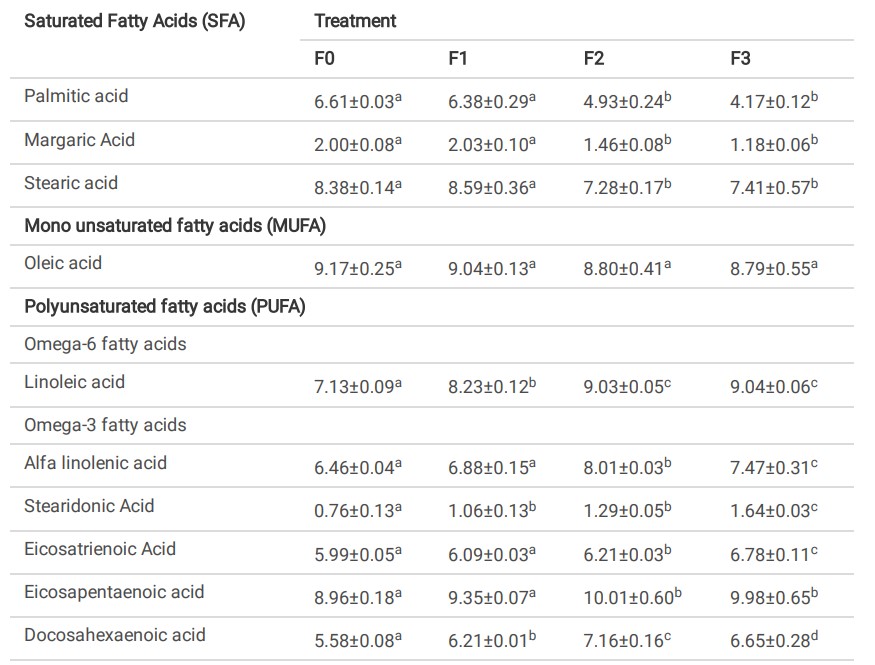 Thành phần axit béo ở các nghiệm thức khác nhau, nghiệm thức F0 và F1 có tỷ lệ axit béo bão hòa (SFA) cao đáng kể (p<0,05, Bảng 3) so với F2 và F3. Ngược lại, nghiệm thức F2 và F3 có axit béo không bão hòa đa (PUFA) tương đối cao so với F0 và F1. Tuy nhiên, nồng độ axit béo không bão hòa đơn (MUFA) trong tôm là tương tự nhau (p<0,05, Bảng 3) qua các nghiệm thức. MUFA cao nhất (9,17 ± 0,25) được tìm thấy ở tôm được nuôi bằng F0, trong khi thấp nhất (8,80±0,41) được tìm thấy ở tôm được nuôi bằng F3.