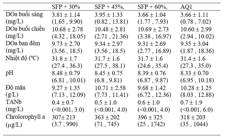 Bảng 1 – Tóm tắt các thông số chất lượng nước cho 4 nghiệm thức trong giai đoạn nuôi 13 tuần. Các giá trị được trình bày dưới dạng trung bình ( độ lệch chuẩn và giá trị tối đa và tối thiểu được trình bày trong ngoặc đơn