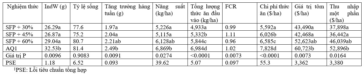 Chi phí thức ăn và giá trị kinh tế của tôm sản xuất được tóm tắt trong Bảng 2. Sự khác biệt đáng kể đã được tìm thấy cho tất cả các nghiệm thức trong cả đầu vào thức ăn và chi phí thức ăn. Tuy nhiên, đối với giá trị tôm và chênh lệch thống kê thu nhập một phần chỉ được tìm thấy giữa cả nghiệm thức SPF + 30% và SFP + 45% so với AQ1.