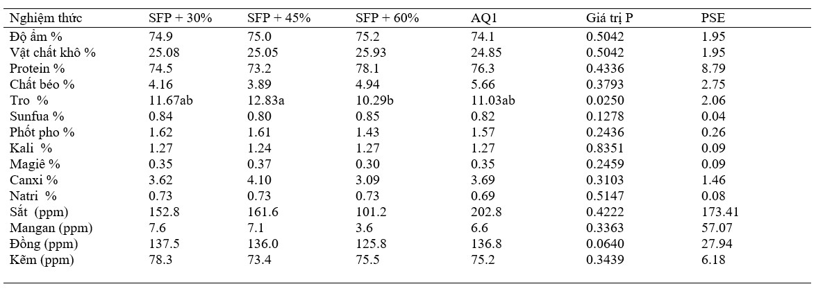 Bảng 3 – Phương tiện thành phần toàn thân cho từng nghiệm thức theo phân tích của Phòng thí nghiệm Trung Tây (Omaha, NE, Hoa Kỳ)