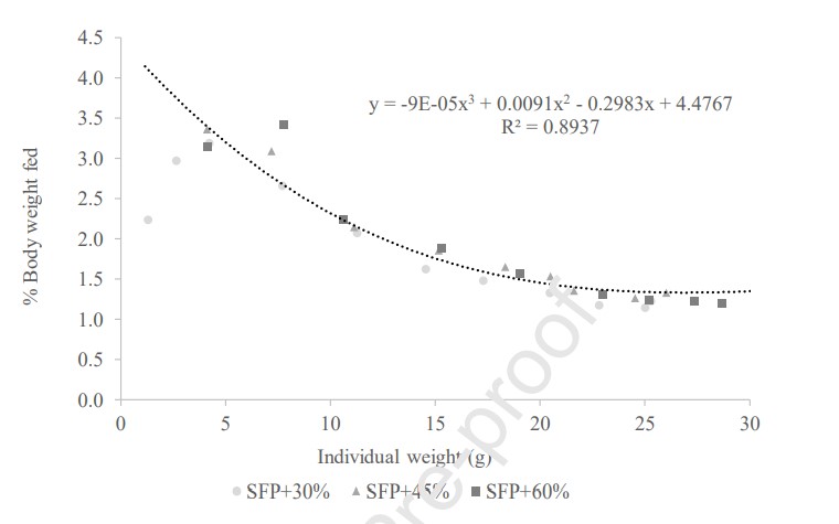Tôm không được lấy mẫu trong tuần đầu tiên vì rất khó lấy mẫu đại diện với tôm nhỏ trong ao. Do đó, ngoại trừ vài tuần đầu tiên sản xuất, dữ liệu thu thập được có thể được sử dụng để phát triển đường cong thức ăn. Để làm điều này, tỷ lệ sống cuối cùng được sử dụng để tính toán lại số lượng tôm ước tính tại bất kỳ thời điểm nào và phần trăm trọng lượng cơ thể được tính toán. Dữ liệu này được trình bày trong Hình 4 không bao gồm dữ liệu từ 17 ngày đầu tiên sản xuất. Dữ liệu này sau đó có thể được sử dụng làm tỷ lệ thức ăn khuyến nghị cho tôm được sản xuất trong các điều kiện tương tự.