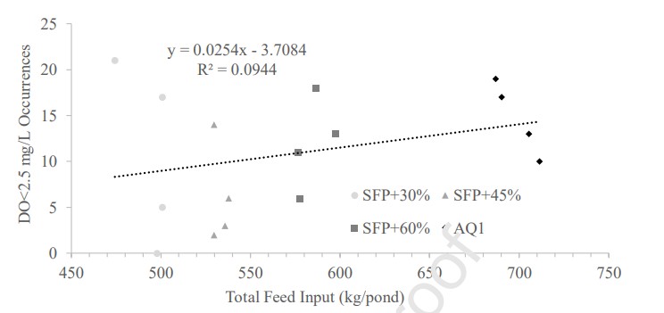 Trong thử nghiệm này, các thông số chất lượng nước chính được giữ trong phạm vi điển hình cho sản xuất tôm (Boyd và Tucker, 1992) (Bảng 1). Để đánh giá ảnh hưởng của việc nạp chất dinh dưỡng đối với nhu cầu oxy. Trong mùa hè, DO thường dưới 2.5. Hình 1 cho thấy lượng DO thấp trong mỗi ao được xác định bằng nghiệm thức. Phân tích hồi quy được thực hiện trên toàn bộ tập dữ liệu được hồi quy so với đầu vào nguồn cấp thức ăn cuối cùng. Mặc dù thức ăn đầu vào ảnh hưởng đến nhu cầu oxy sinh học (BOD) của ao và hầu hết các trường hợp xảy ra đã được đăng ký vào buổi sáng, không có mối tương quan tuyến tính (R2 = 0,0944) (Hình 1) giữa số lần xuất hiện oxy thấp (<2,5 mg/ L) trong số đọc DO và lượng thức ăn đầu vào cho mỗi ao.